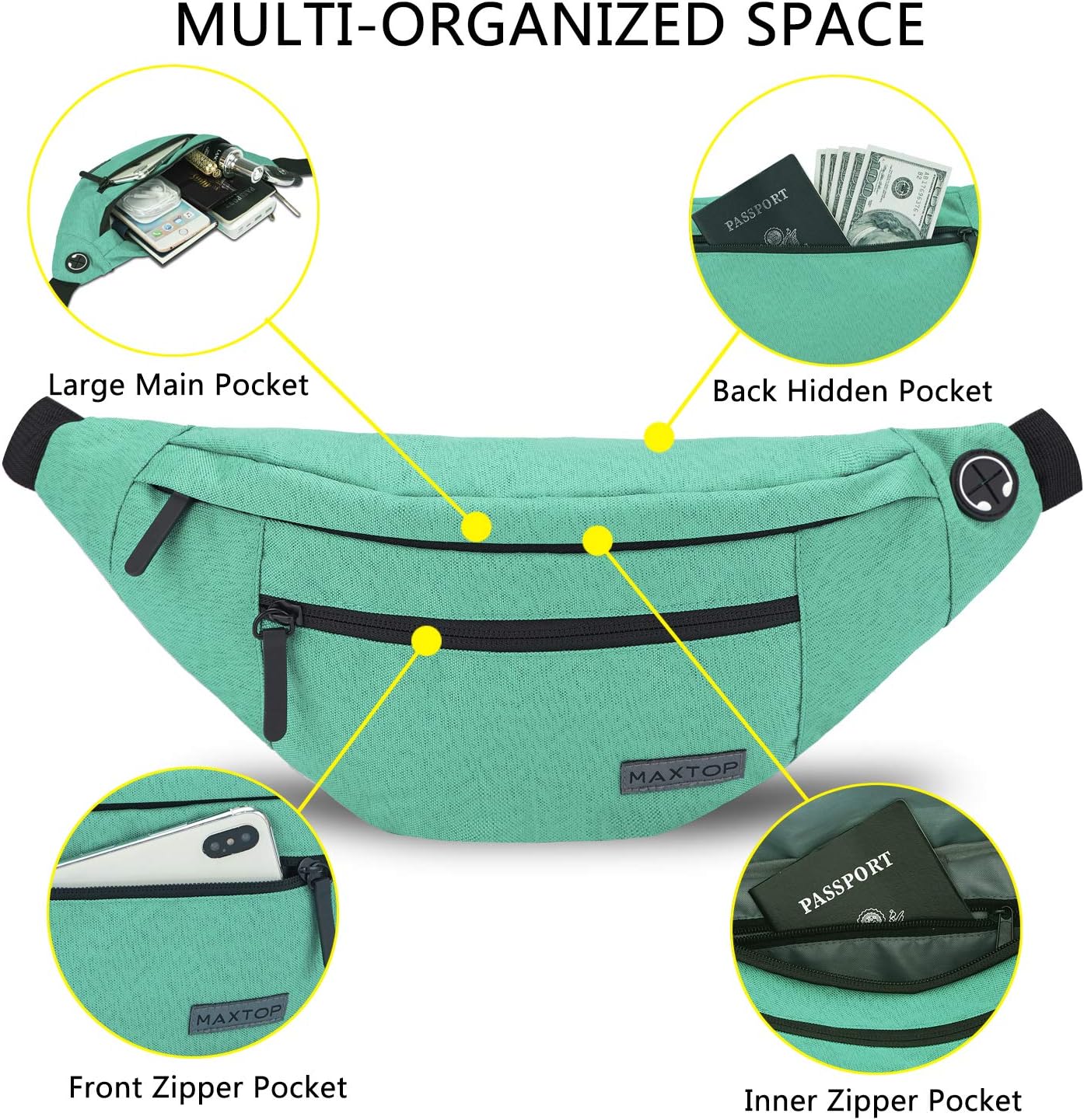 这款腰包容量很大,超能装,既可做腰包,也可揹着或斜挎,多种颜色,想要什么style就有什么style。防水材料,耐脏耐用。共有四个拉链口袋,背部还有一个防盗小袋,十分安全。在出行或运动时,必要小件都可以装下,比如手机、钱包、证件等等。侧面还有耳机孔和专门用来挂钥匙的扣环,设计超贴心啰。