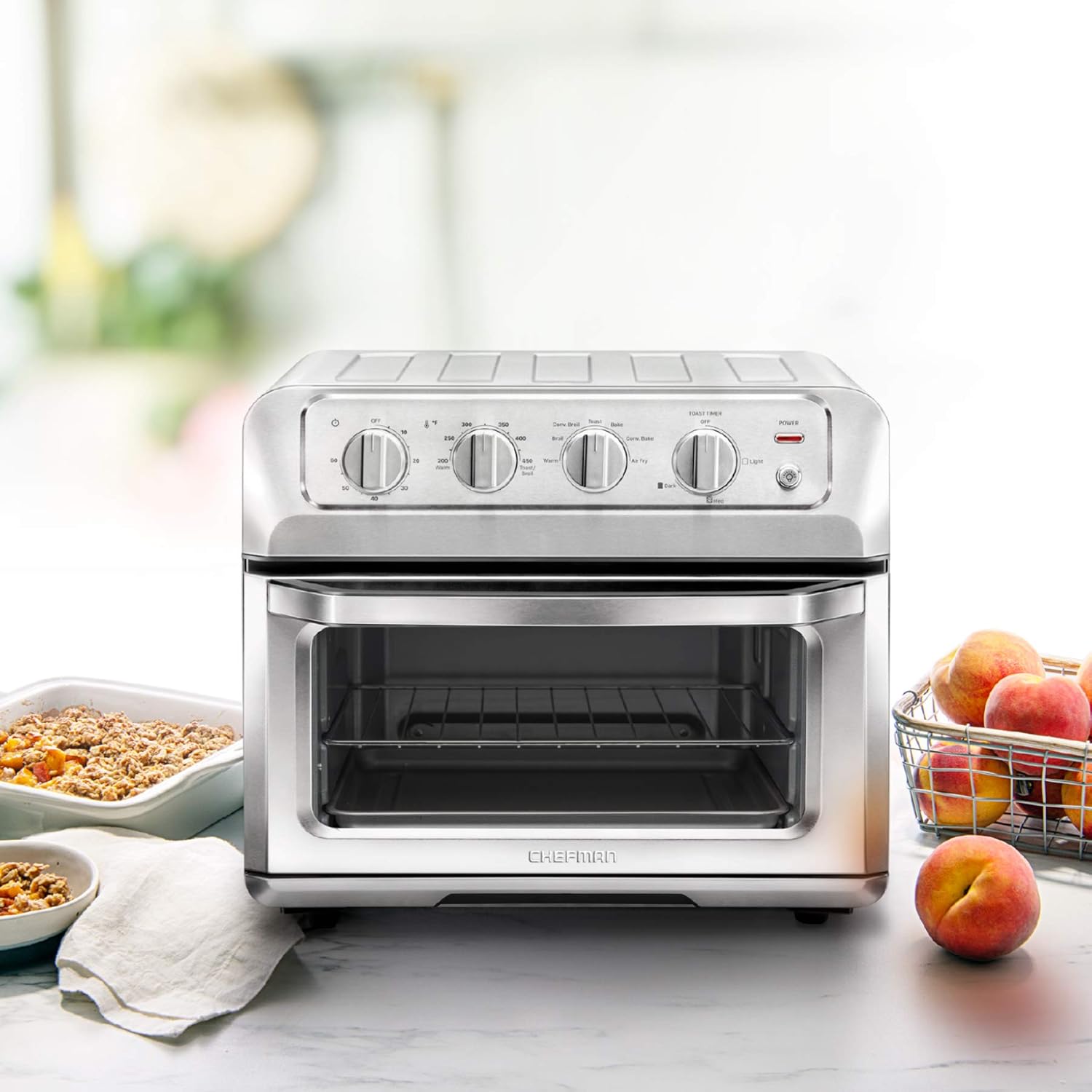 这款气炸烤箱是空气炸锅、烤箱和吐司机的混合体,共有7种功能,既能用来做健康的少油炸物料理,也可以做烤鸡等等传统的烤箱菜,至少比传统炸锅减少98%的油量。温度可控制在200至450华氏度,还有定时和自动断电功能。20升大容量,满足全家人需求。内附四种烤盘烤架,无需再额外购置。